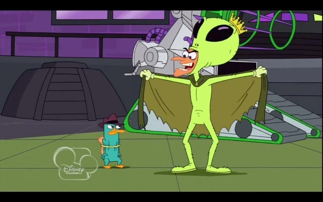 do zabawy, sprytnym sposobem unieruchamia dziobaka. Przedstawia Pepe swój nowy wynalazek - Kosmitoinator, po czym objaśnia, że jest to projektor, który wyświetli w centrum miasta hologramowy obraz kosmitów. Dundersztyc zamierza przejąć w ten sposób władzę nad Okręgiem Trzech Stanów.